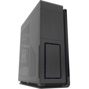 Obří počítačová skříň o rozměrech 650mm (výška), 250mm (šířka), 600mm (hloubka) s průhledným oknem v levé bočnici.