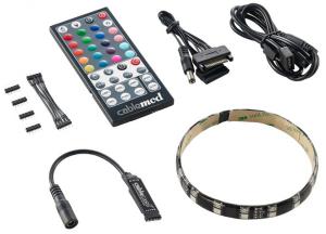 Softwarově řiditelná sada podsvícení obsahující čtyři 30cm dlouhé pásy s UV a RGB diodami.